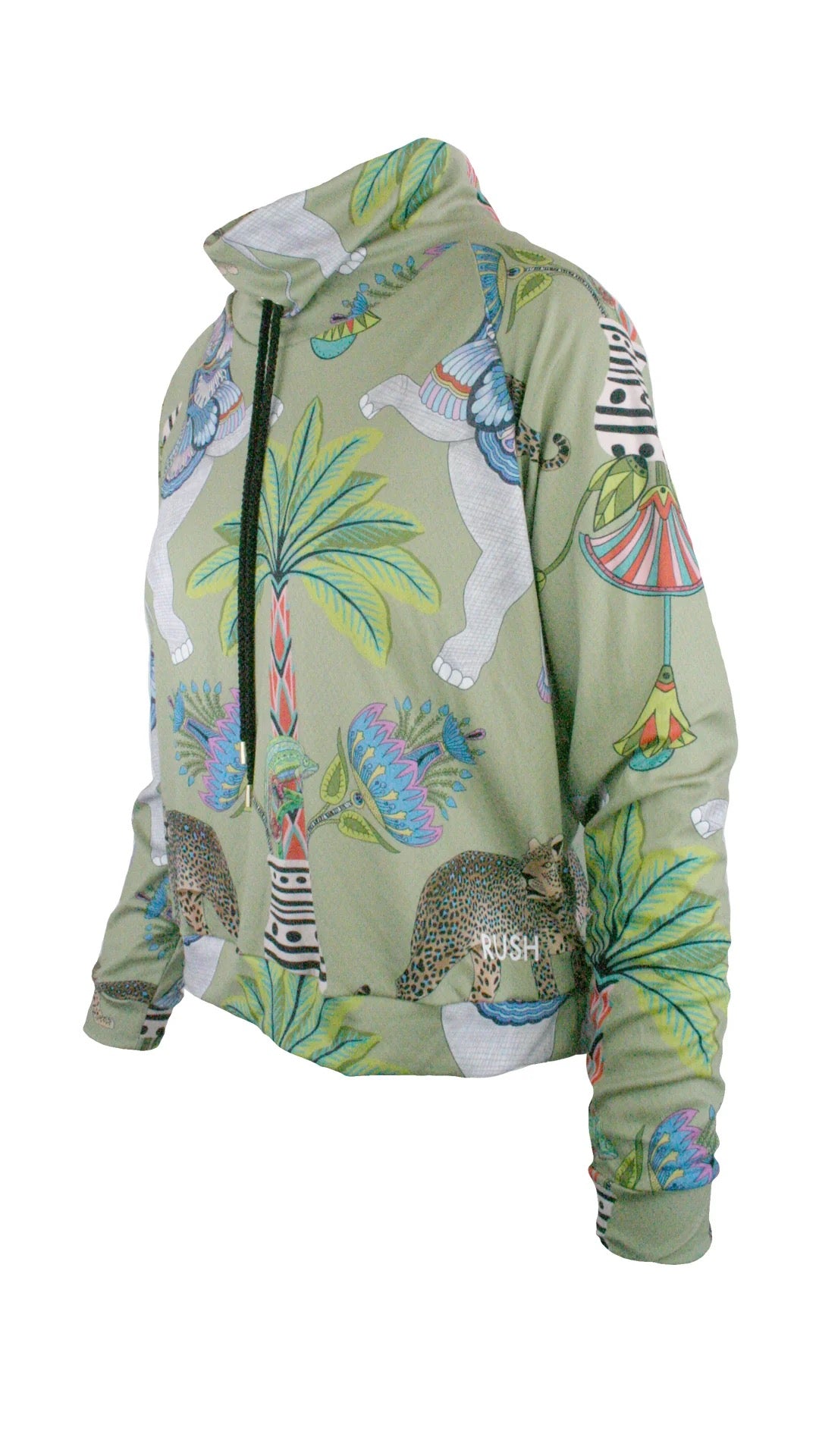Relaxed fit, cropped pullover with drawstring funnel neck and raglan sleeves.