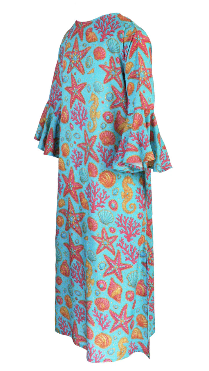 Colorful dress with sea-themed pattern on a white background