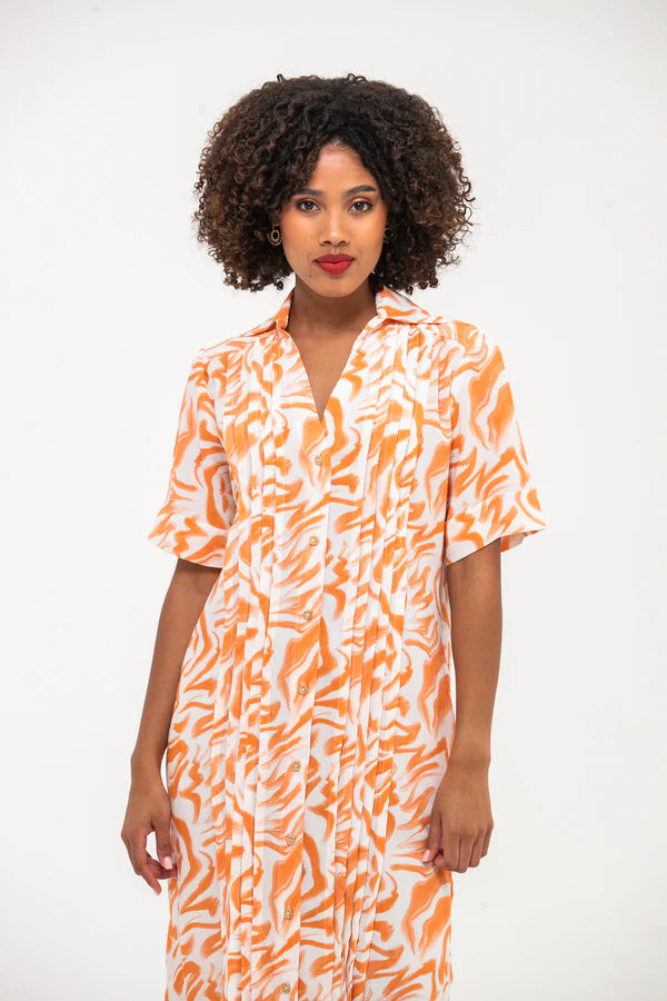 Designed to fall gracefully to mid-calf, the SANTORINI PINTUCK DRESS features a classic shirt-style collar and a button stand with a distinctive button loop feature, adding a sophisticated flair. The 3/4 sleeves are highlighted by deep, exaggerated cuffs, giving the dress a modern edge and an elegant silhouette.