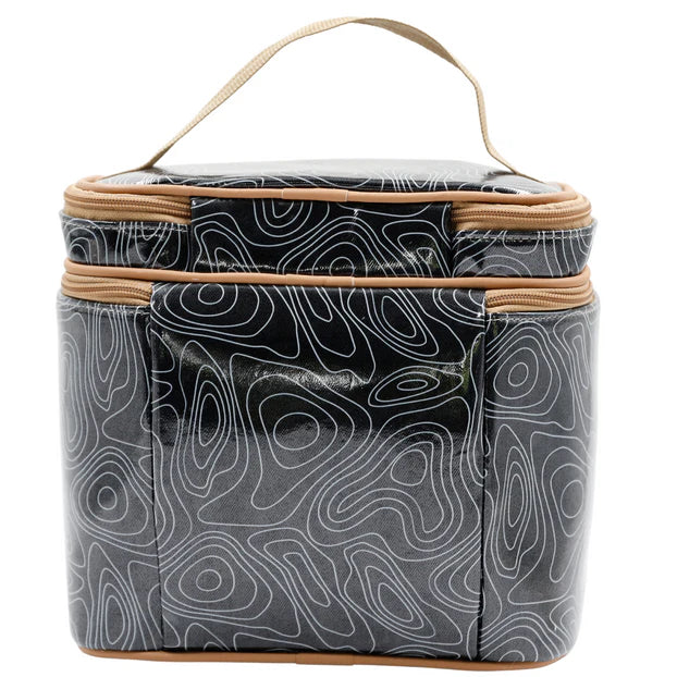 insulated toiletry bag with black & white pattern and brown accents on a white background