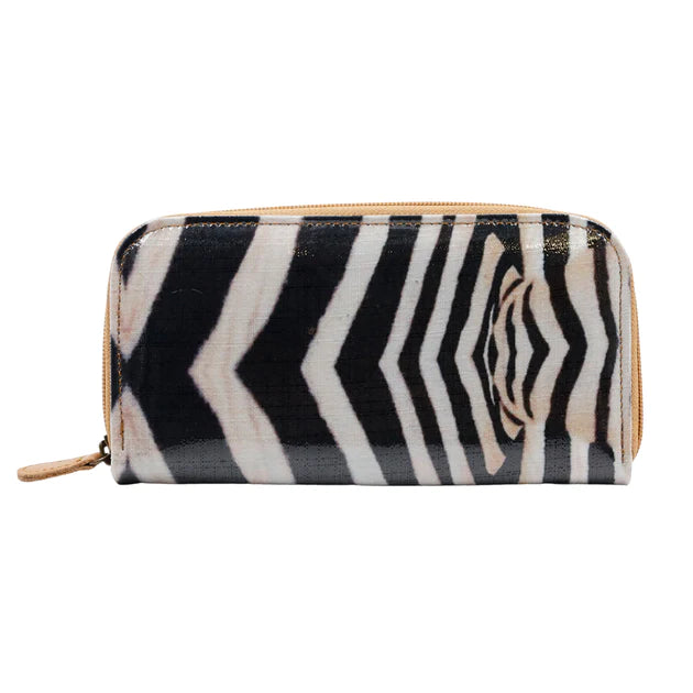Our new favourite! Our wallet is made with waterproof PVC laminated fabric. The inside is genuine leather. It includes 10 card components, 2 separate note components and one coin compartment that zips closed. Wallet zips closed around the outside.