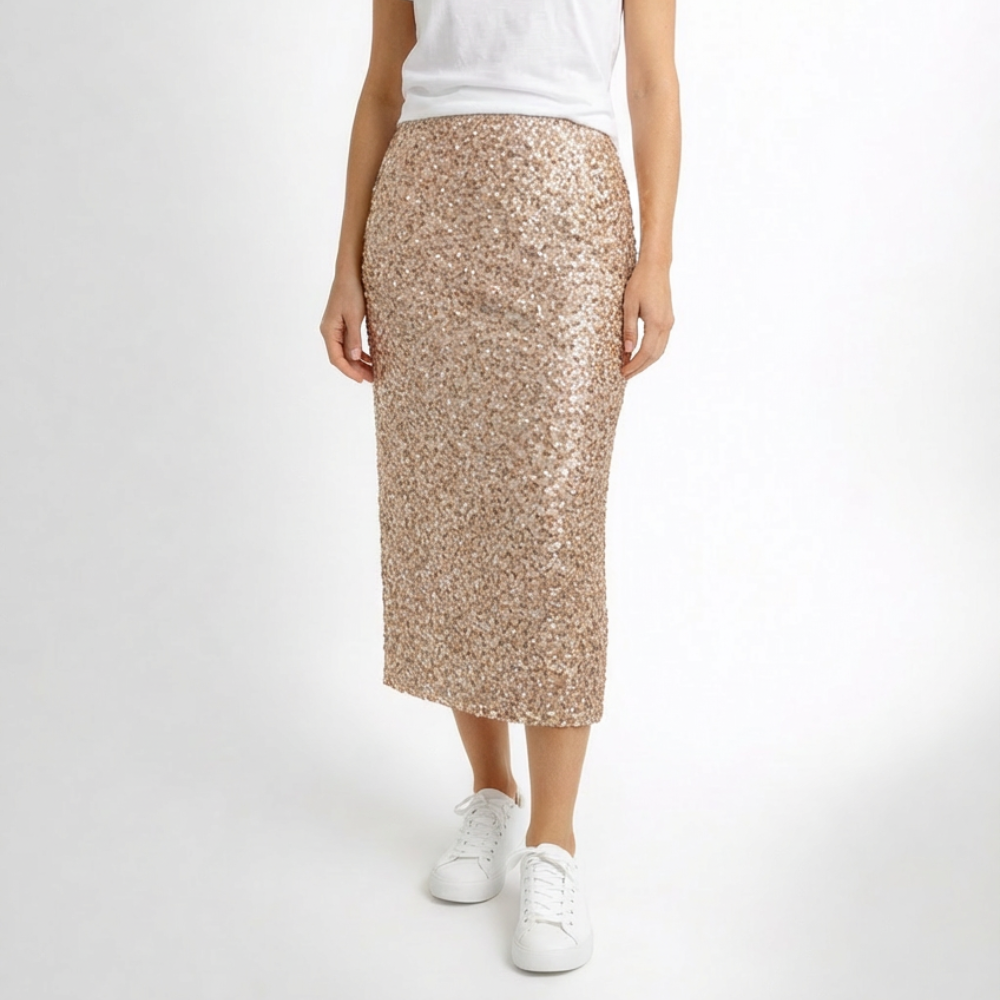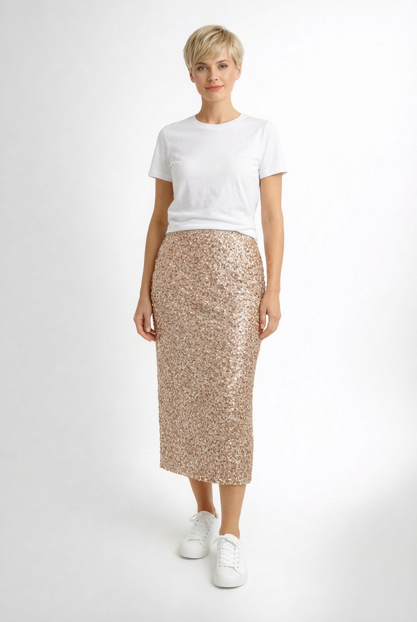 Its shimmering sequins add a touch of glamour, making it perfect for both casual and dressy occasions. For a laid-back look, pair it with a simple T-shirt and sneakers, adding a jacket or jersey as the temperatures drop. To elevate your ensemble, choose boots and a crisp, collared shirt, creating a chic outfit suitable for a night out or a special event. This skirt effortlessly combines comfort and style, ensuring you look fabulous in any setting.