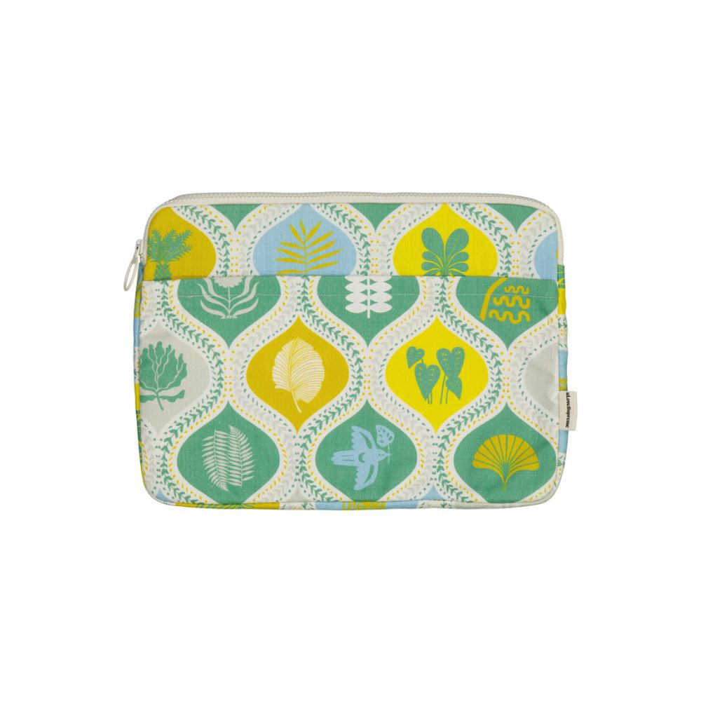 • Load image into Gallery viewer, Patterned iPad sleeve with green and yellow design on a white background