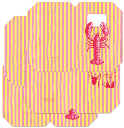 Set of 4 A4 book covers with pink lobster & bikini design on yellow & pink striped background