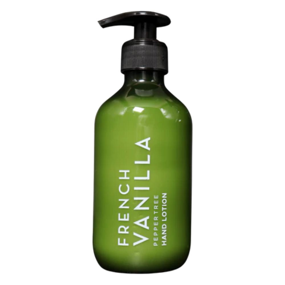 Green bottle of French Vanilla hand lotion with a pump on a white background