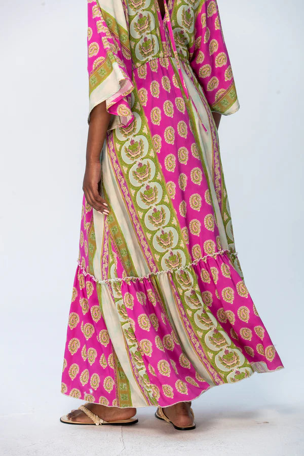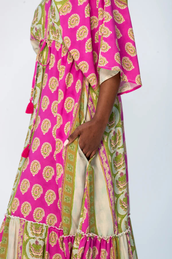 Artistic expression meets flowing elegance in the new GEORGIA KAFTAN MAXI DRESS. This vibrant piece showcases bold paisley and floral prints in striking pink, green, and cream - a celebration of pattern and color that embodies creative confidence.
