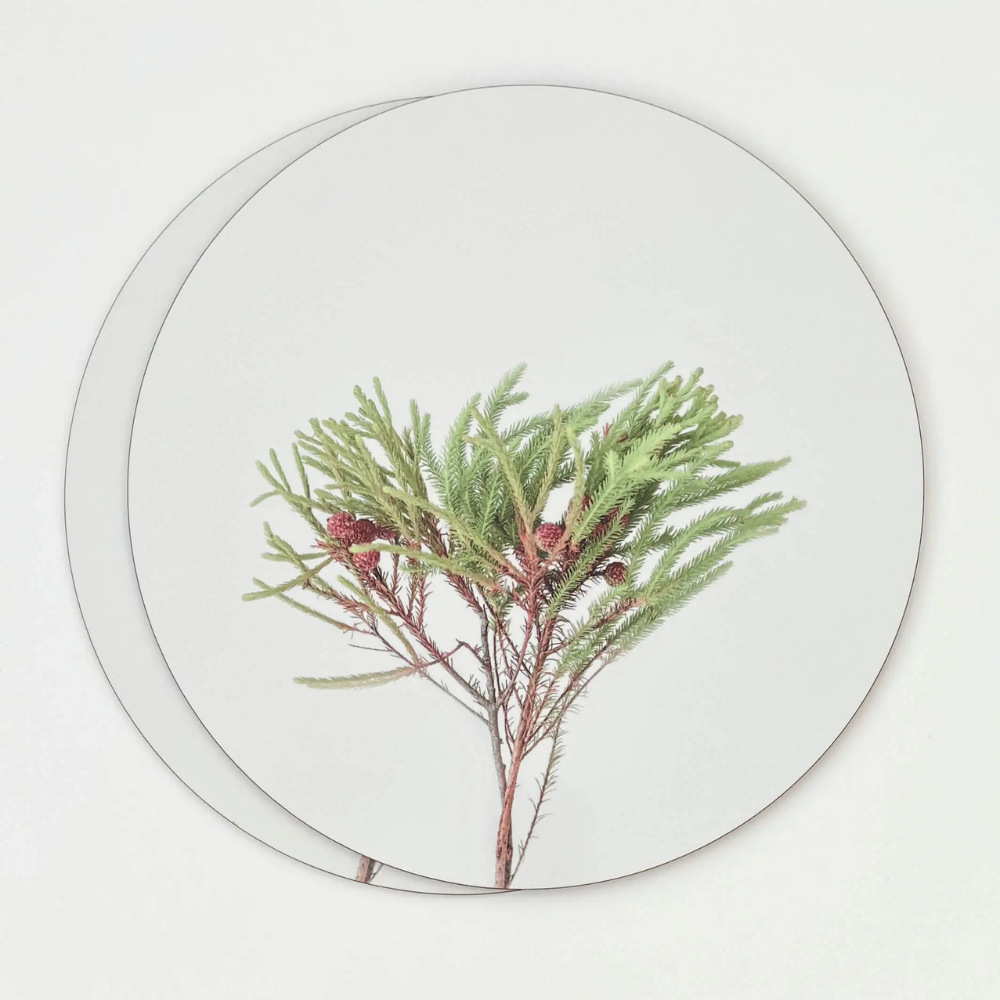 • Load image into Gallery viewer, Round placemats with a fynbos branch design on a white background
