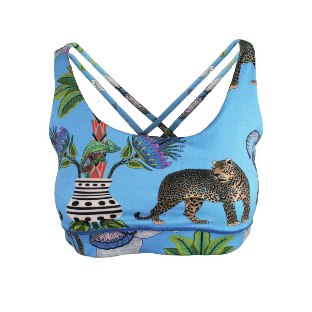 • Load image into Gallery viewer, Blue sports bra with a leopard and floral design on a white background