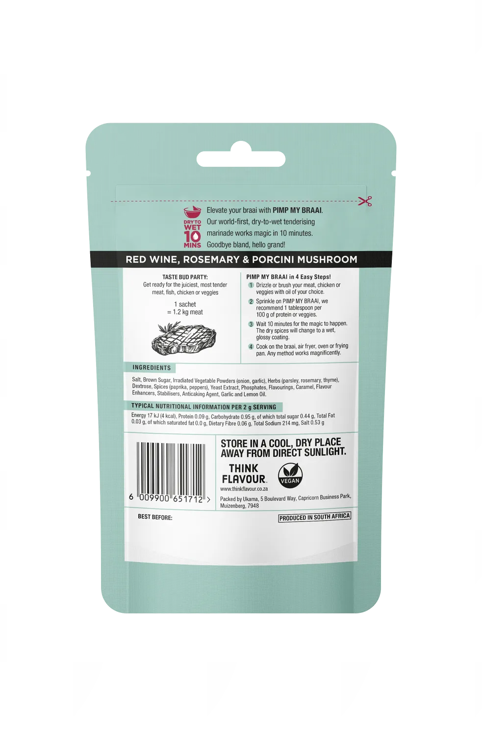 Unlock bold flavours with the Pimp My Braai Red Wine, Rosemary & Porcini Mushroom Dry Rub! In just 20 minutes, this easy-to-use rub transforms into a glossy marinade, perfect for meats, veggies, and fish. Pair with your favourite ingredients for a deliciously creative twist on every meal.