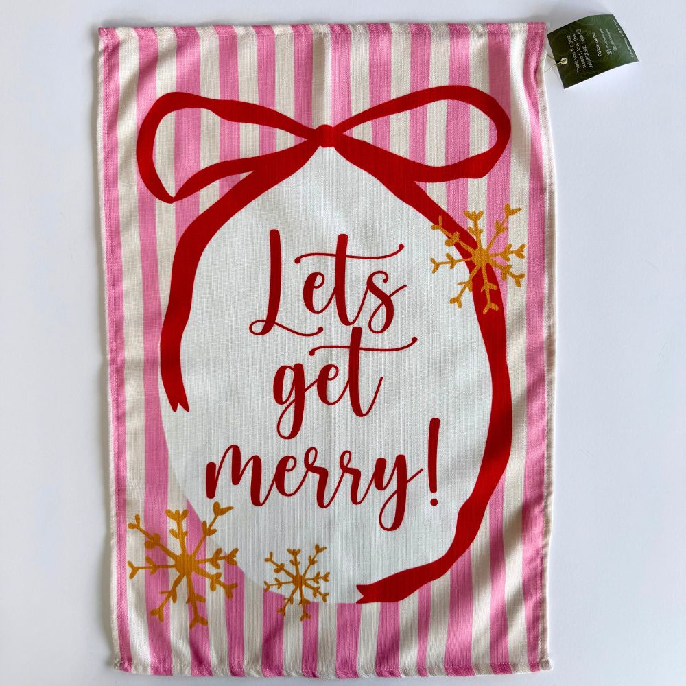 Te Towel with 'Let's get merry!' text and red bow on pink and white striped background